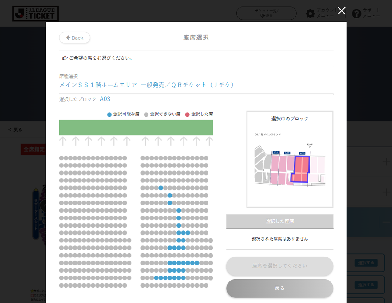 座席指定が可能な試合では、試合選択時もしくは席種選択時に座席選択可と表示されます。