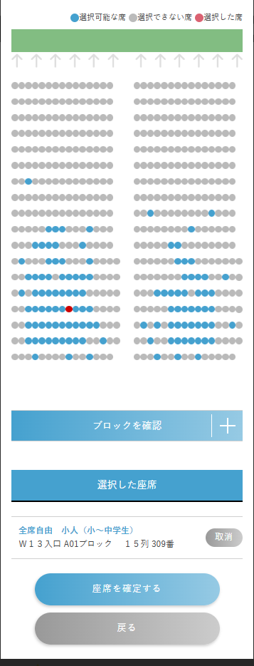 ご希望の座席を選択後、『座席を確定する』ボタンをクリックします。