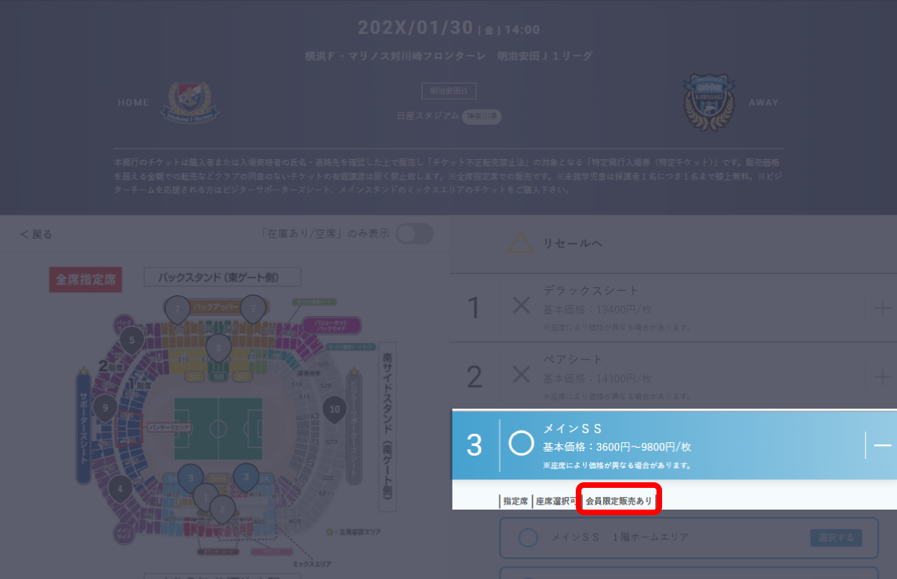 会員限定発売とは、各クラブが導入している会員制度により、会員(シーズンシートやファンクラブ等)の方のみが利用できる発売です。